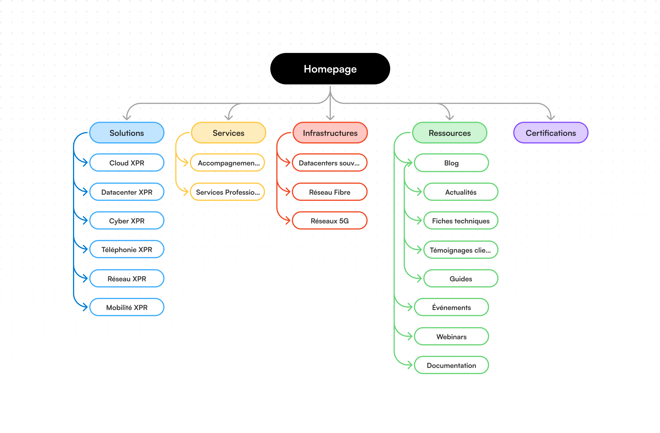 J’ai réalisé le Design System à partir de ce nouveau branding. Celui-ci m’a ensuite permis de réaliser les maquettes UX/UI, puis de les intégrer dans le nouveau CMS. L’architecture du site a été repensée et simplifiée autour de pages clés (Accueil, Solutions, Infrastructures, Blog, Documentation). Les templates ont été mis en place à partir de ces différents types de pages. Le maillage interne a été repensé pour guider l’utilisateur·rice et générer des leads qualifiés.