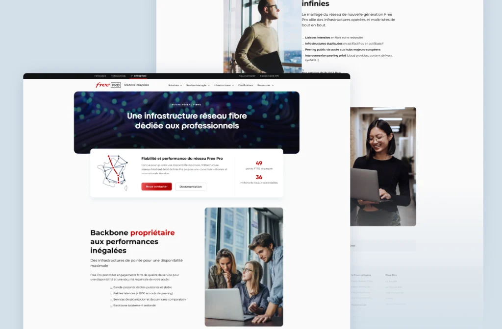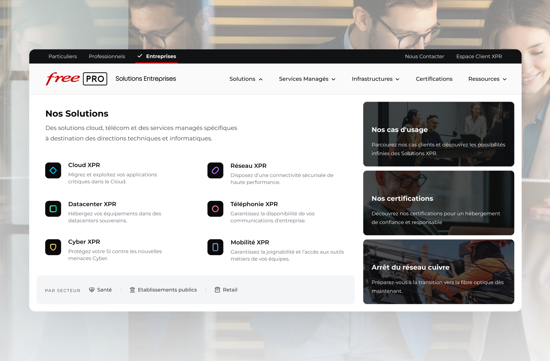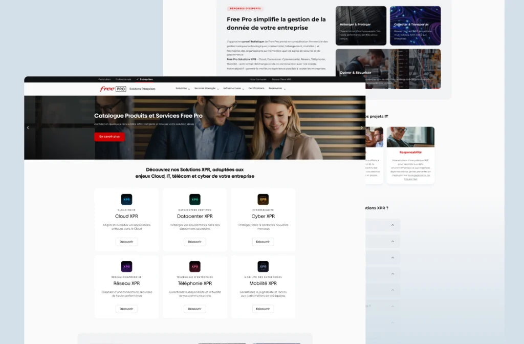La problématique consistait à intégrer ces solutions complexes dans l’univers Free, en les rendant plus accessibles sans affaiblir la perception d’expertise ni dénaturer leur ADN, afin de s’adresser à un public plus élargi, des décideur·rices non techniques aux profils experts (DSI, CTO, Experts IT…).